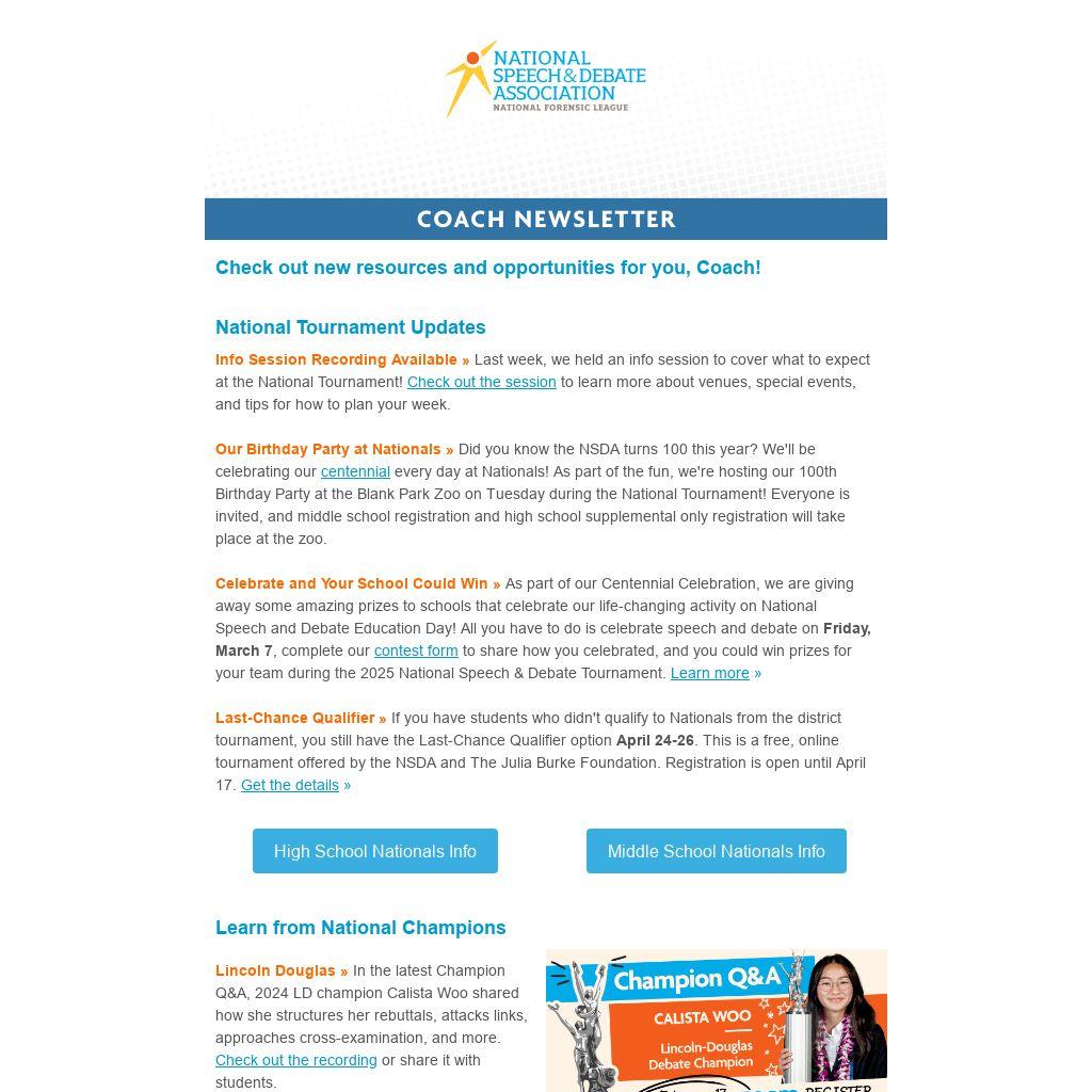 Middle School (National) » Recognize a coach who champions speech and debate! Nominations for the Middle School Coach of the Year Award are due May 1. These nominations are evaluated by the national office to choose the winner.