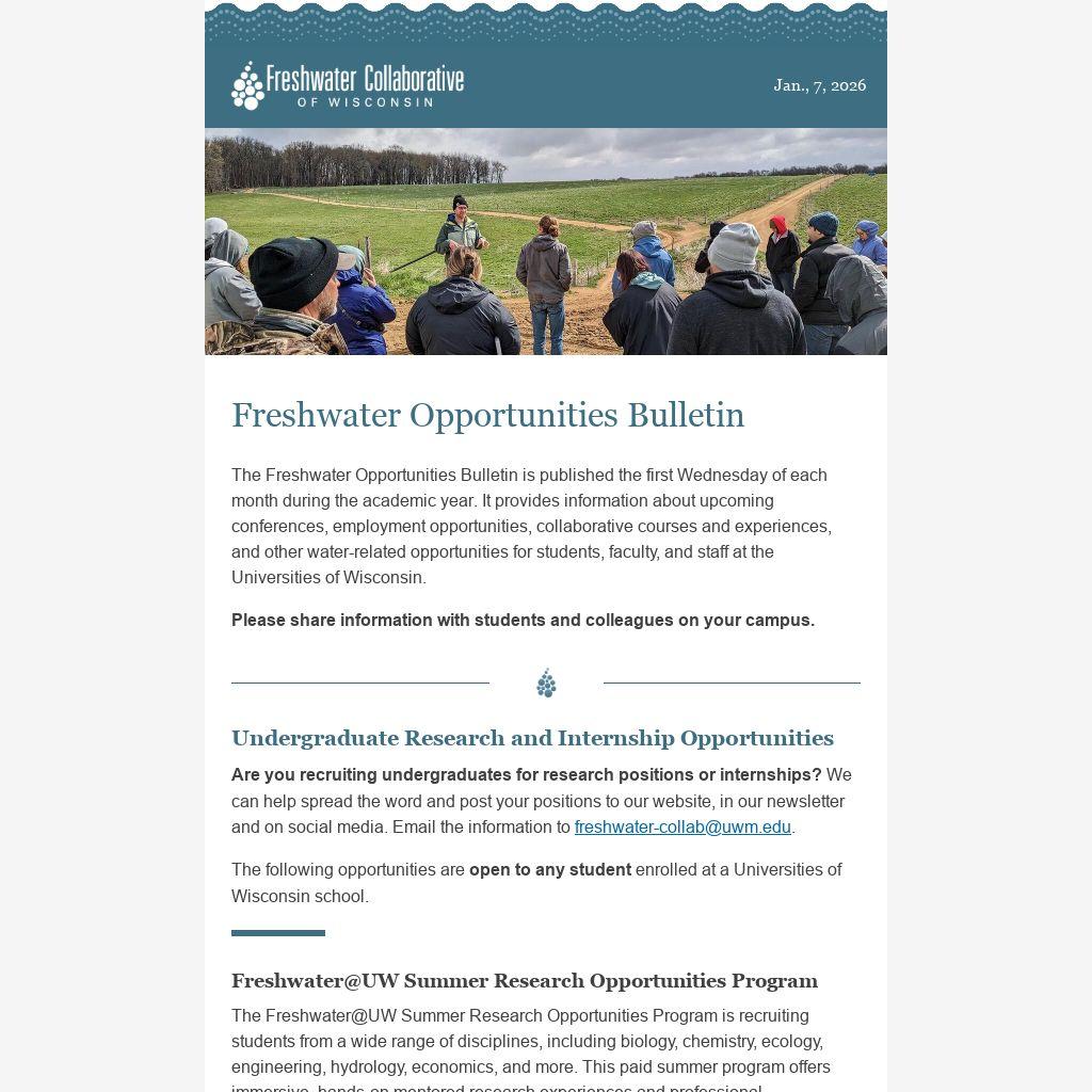 The Freshwater Opportunities Bulletin is published the first Wednesday of each month during the academic year. It provides information about upcoming conferences, employment opportunities, collaborative courses and experiences, and other water-related opportunities for students, faculty, and staff at the Universities of Wisconsin.