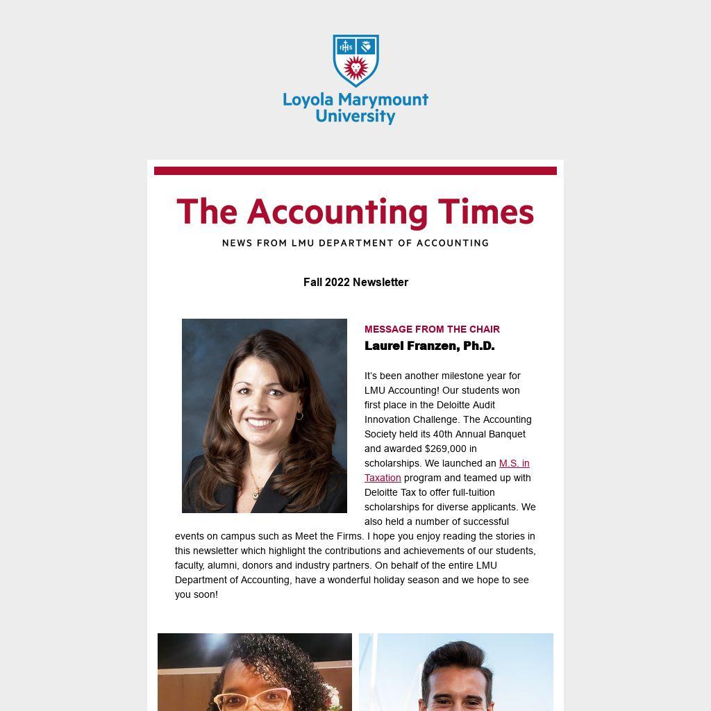 With a curriculum steeped in ethical practice and a tradition of excellence, LMU Accounting is well-positioned to continue delivering life-changing educational experiences for the business leaders of tomorrow. We appreciate your support!