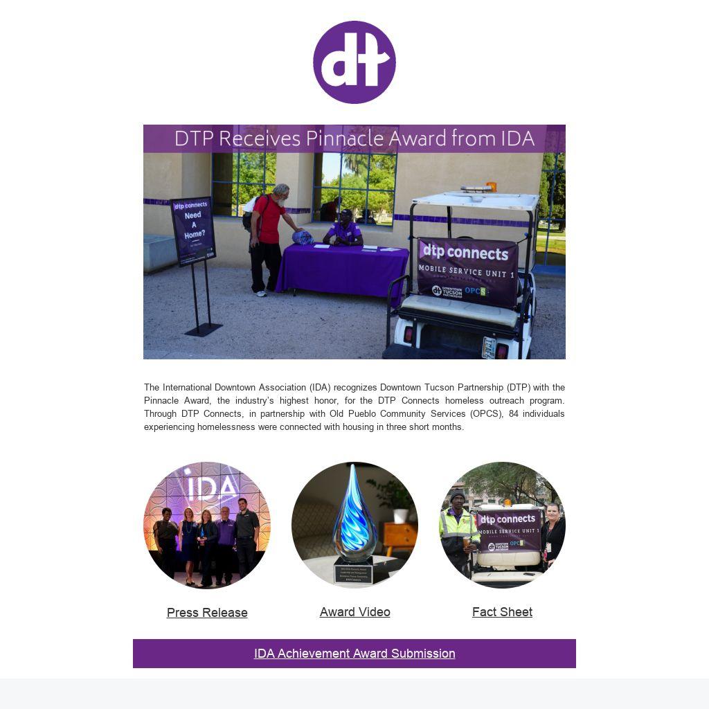 The International Downtown Association (IDA) recognizes Downtown Tucson Partnership (DTP) with the Pinnacle Award, the industry’s highest honor, for the DTP Connects homeless outreach program. Through DTP Connects, in partnership with Old Pueblo Community Services (OPCS), 84 individuals experiencing homelessness were connected with housing in three short months.