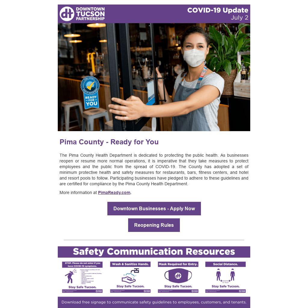 Both programs are part of a larger partnership with the County’s Back to Business initiative that enables DTP to provide grants to help businesses make the operational and physical changes needed to respond to the COVID-19 pandemic. Pima County’s work with DTP will provide a model to be replicated in other areas of the County.