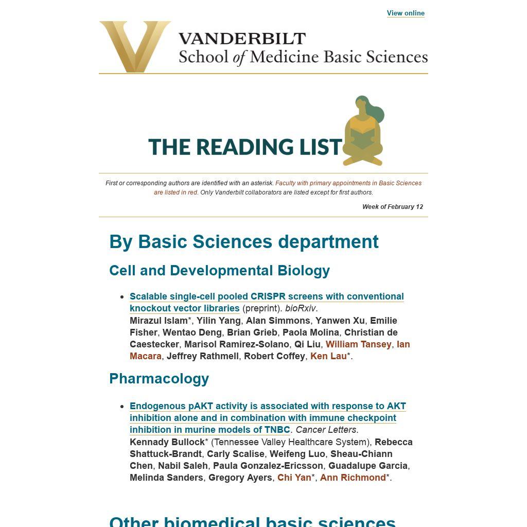 First or corresponding authors are identified with an asterisk. Faculty with primary appointments in Basic Sciences are listed in red. Only Vanderbilt collaborators are listed except for first authors.