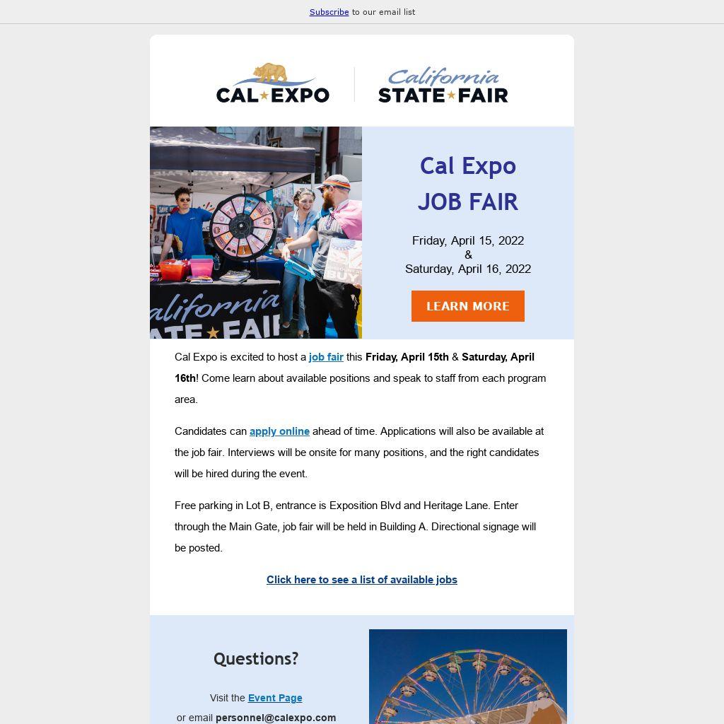 Cal Expo is excited to host a job fair this Friday, April 15th & Saturday, April 16th! Come learn about available positions and speak to staff from each program area.