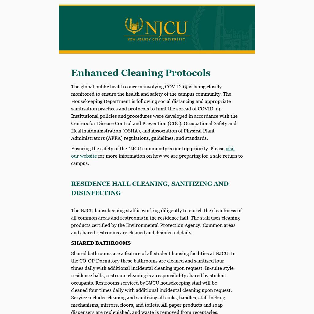 The NJCU housekeeping staff is working diligently to enrich the cleanliness of all common areas and restrooms in the residence hall. The staff uses cleaning products certified by the Environmental Protection Agency. Common areas and shared restrooms are cleaned and disinfected daily.