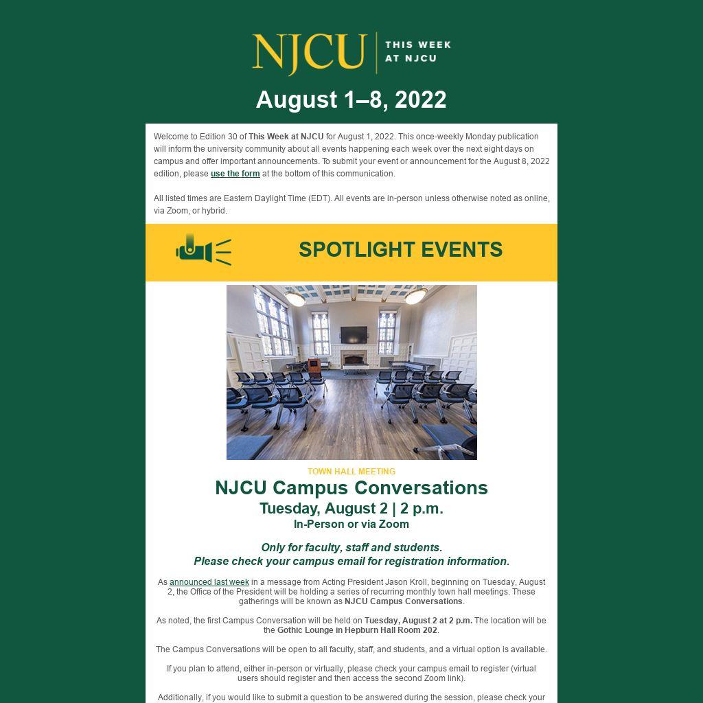 Welcome to Edition 30 of This Week at NJCU for August 1, 2022. This once-weekly Monday publication will inform the university community about all events happening each week over the next eight days on campus and offer important announcements. To submit your event or announcement for the August 8, 2022 edition, please use the form at the bottom of this communication.