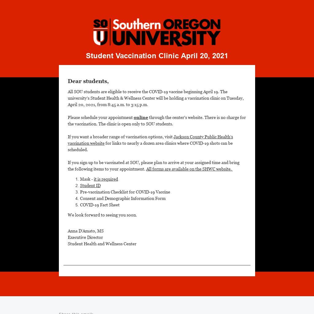 All SOU students are eligible to receive the COVID-19 vaccine beginning April 19. The university’s Student Health & Wellness Center will be holding a vaccination clinic on Tuesday, April 20, 2021, from 8:45 a.m. to 3:15 p.m.
