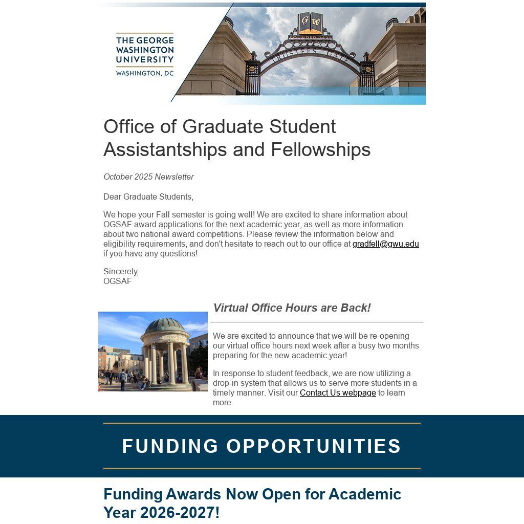 We hope your Fall semester is going well! We are excited to share information about OGSAF award applications for the next academic year, as well as more information about two national award competitions. Please review the information below and eligibility requirements, and don't hesitate to reach out to our office at gradfell@gwu.edu if you have any questions!