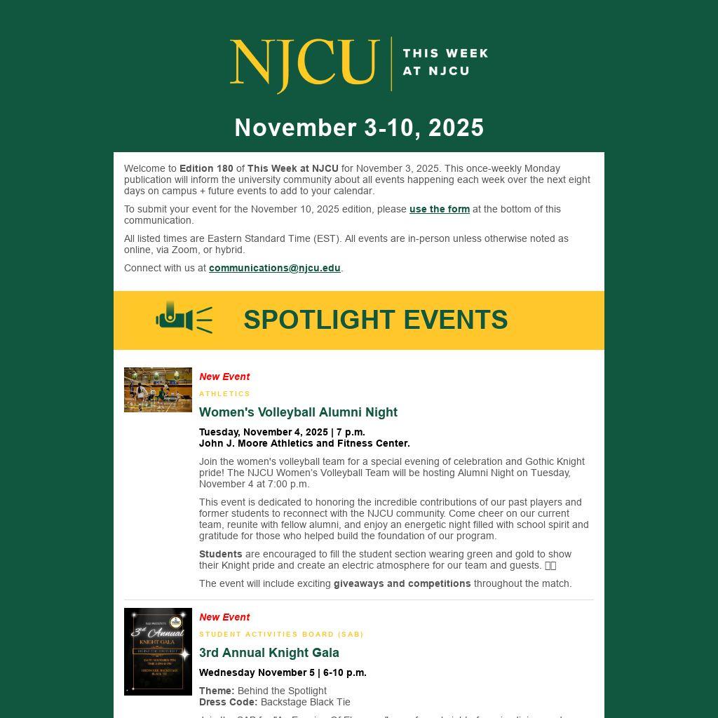 Welcome to Edition 180 of This Week at NJCU for November 3, 2025. This once-weekly Monday publication will inform the university community about all events happening each week over the next eight days on campus + future events to add to your calendar.