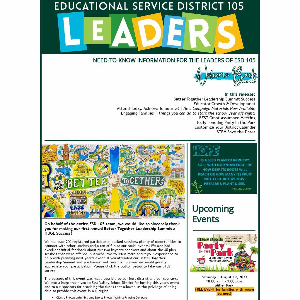 On behalf of the entire ESD 105 team, we would like to sincerely thank you for making our first annual Better Together Leadership Summit a HUGE Success!