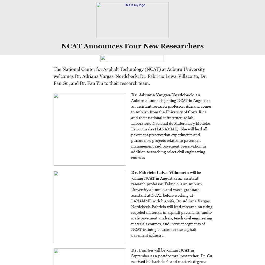 Dr. Fabricio Leiva-Villacorta will be joining NCAT in August as an assistant research professor. Fabricio is an Auburn University alumnus and was a graduate assistant at NCAT before working at LANAMME with his wife, Dr. Adriana Vargas-Nordcbeck. Fabricio will lead research on using recycled materials in asphalt pavements, multi-scale pavement analysis, teach civil engineering materials courses, and instruct segments of NCAT training courses for the asphalt pavement industry.