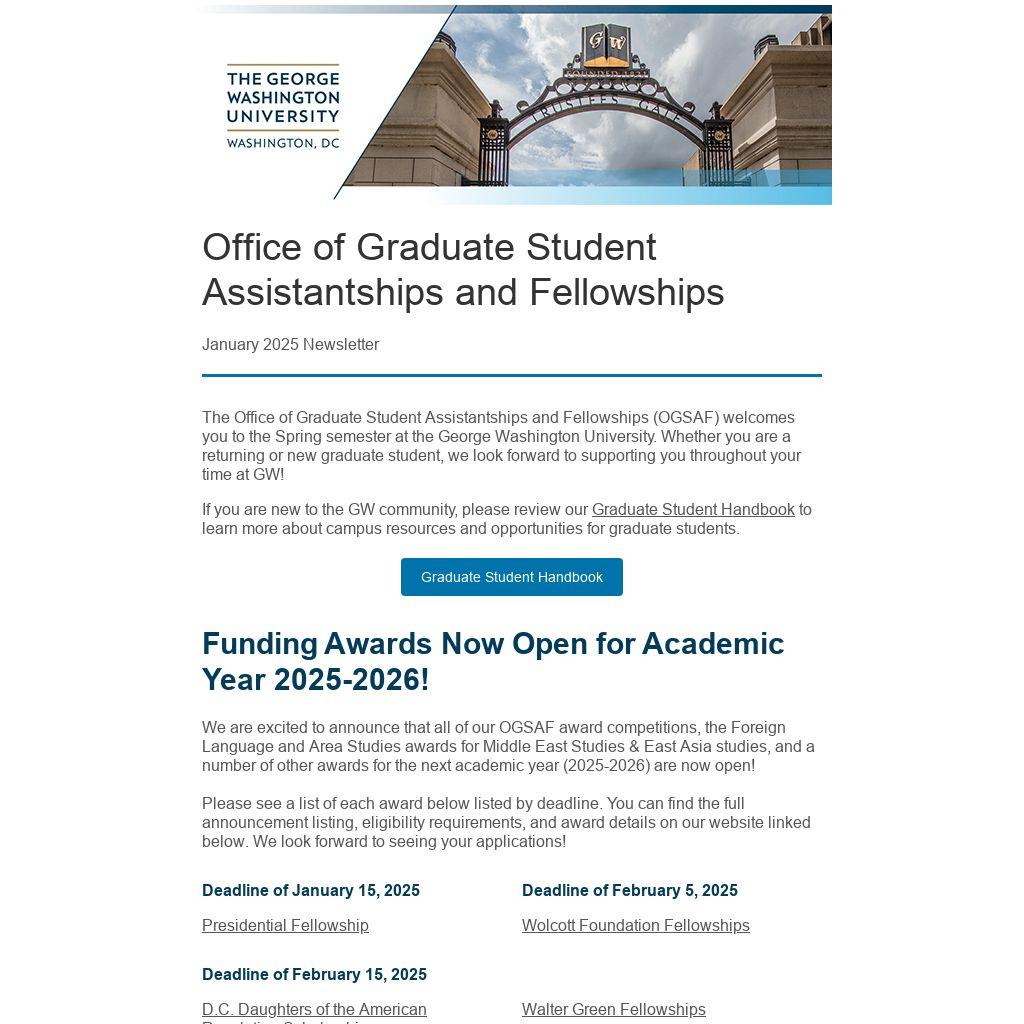 The Office of Graduate Student Assistantships and Fellowships (OGSAF) welcomes you to the Spring semester at the George Washington University. Whether you are a returning or new graduate student, we look forward to supporting you throughout your time at GW!