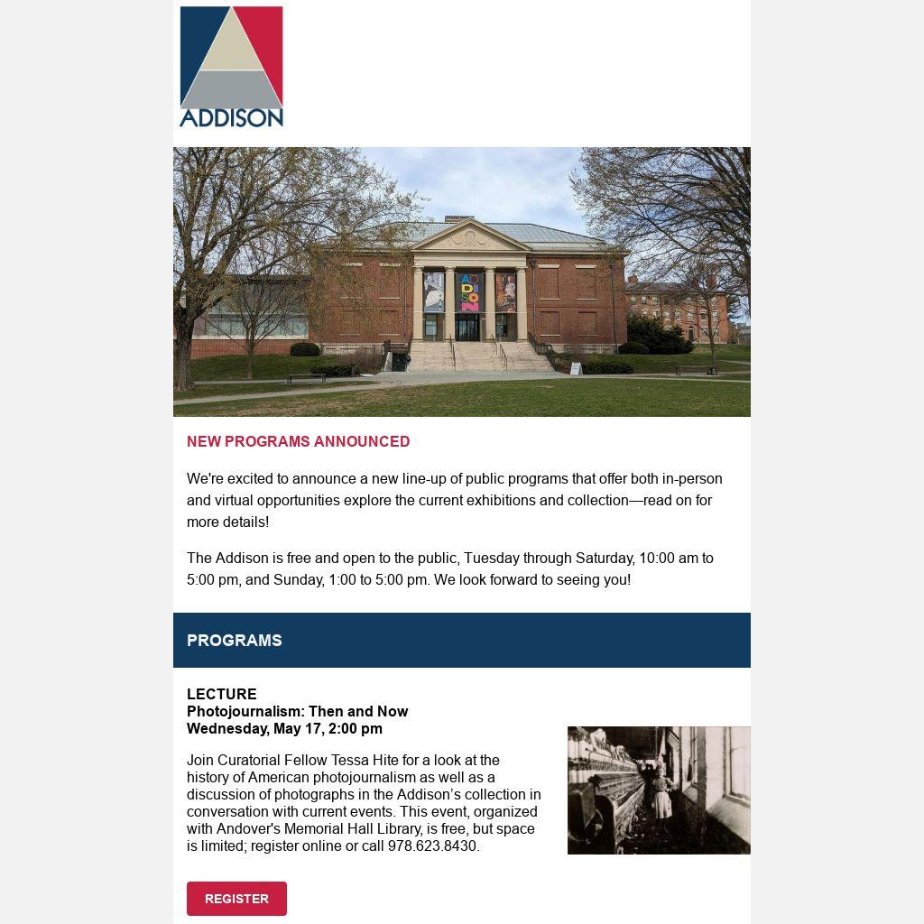 Addison Gallery exterior, Addison staff; Lewis Wickes Hine, A Little Spinner in a Georgia Cotton Mill, c. 1910, gelatin silver print, 4 7/8 x 6 3/4 inches, museum purchase, 2019.66; Alison Elizabeth Taylor, The Sum of It, 2017, marquetry hybrid: wood veneer, acrylic, and shellac, 72 x 52 inches, Stephanie and Tim Ingrassia. Photo credit: Courtesy Alison Elizabeth Taylor and James Cohan Gallery, NY; Judy Pfaff, N.E.W.S. (North, East, West, South), 1988, painted steel, found objects, acrylic sheets, 109 x 96 x 43 inches, museum purchase with support of Stephen C. Kaye (PA 1955), 2022.112; Alison Elizabeth Taylor, Only Castles Burning…, 2017, marquetry hybrid: wood veneer, acrylic, pigment print, and shellac, 58 x 63 inches, Bill and Christy Gautreaux, Kansas City, MO. Photo credit: Courtesy Alison Elizabeth Taylor and James Cohan Gallery, NY; Alison Elizabeth Taylor, GSENM: Slot Canyon No. 1, 2018, marquetry hybrid: wood veneer, oil, pigment print, and shellac, 69 x 59 inches, private collection, Miami, FL. Photo credit: Courtesy Alison Elizabeth Taylor and James Cohan Gallery, NY; Sally Mann, Untitled, 1980, silver dye bleach print, 9 1/2 x 7 7/8 inches, gift of Rosamond and Dennis Purcell, 2020.49.7; Lavaughan Jenkins, You kiss the same, 2022, oil on panel, 30 1/8 x 22 5/8 x 2 1/2 inches, courtesy of the artist; Abbott Handerson Thayer, Monadnock Angel,1920–1921, oil on canvas, 91 1/8 x 60 inches, gift of anonymous donor, 1930.17; screenshots of videos and virtual tours, Addison staff.