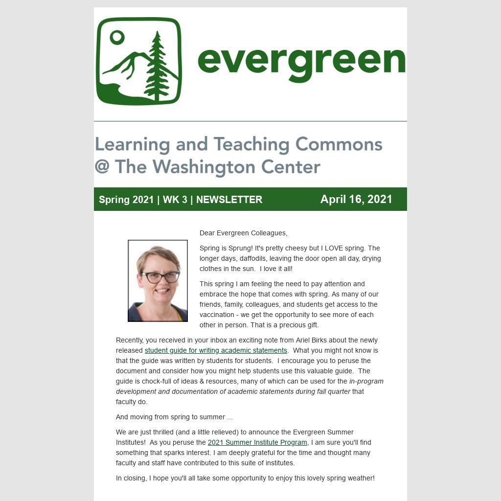 We are just thrilled (and a little relieved) to announce the Evergreen Summer Institutes! As you peruse the 2021 Summer Institute Program, I am sure you'll find something that sparks interest. I am deeply grateful for the time and thought many faculty and staff have contributed to this suite of institutes.