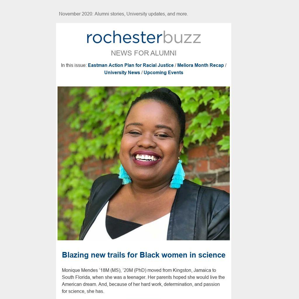 Rochester Buzz is produced by the University of Rochester Office of Alumni Relations. View issues online at rochester.edu/alumni/buzz. Direct feedback and questions to rochesterbuzz@rochester.edu.