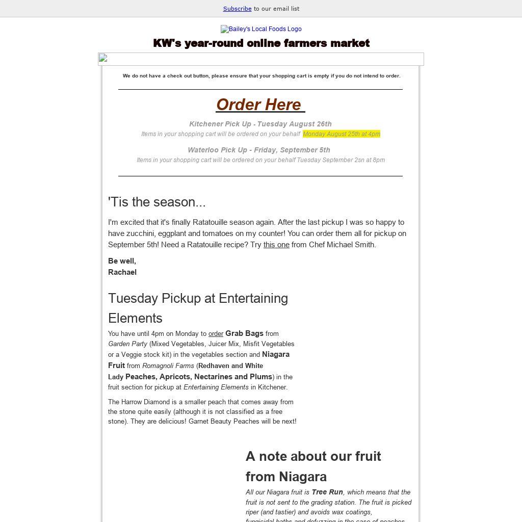 I'm excited that it's finally Ratatouille season again. After the last pickup I was so happy to have zucchini, eggplant and tomatoes on my counter! You can order them all for pickup on September 5th! Need a Ratatouille recipe? Try this one from Chef Michael Smith.
