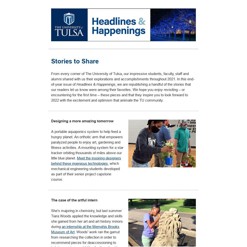 From every corner of The University of Tulsa, our impressive students, faculty, staff and alumni shared with us their explorations and accomplishments throughout 2021. In this end-of-year issue of Headlines & Happenings, we are republishing a handful of the stories that our readers let us know were among their favorites. We hope you enjoy revisiting – or encountering for the first time – these pieces and that they inspire you to look forward to 2022 with the excitement and optimism that animate the TU community.