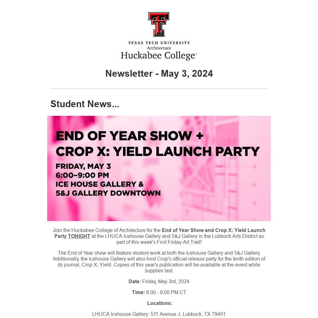 Join the Huckabee College of Architecture for the End of Year Show and Crop X: Yield Launch Party TONIGHT at the LHUCA Icehouse Gallery and 5&J Gallery in the Lubbock Arts District as part of this week's First Friday Art Trail!
