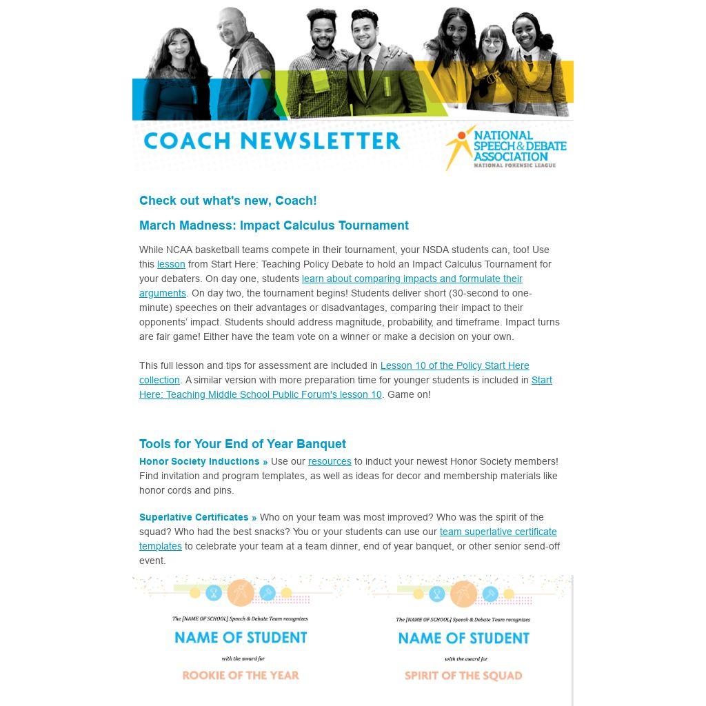 While NCAA basketball teams compete in their tournament, your NSDA students can, too! Use this lesson from Start Here: Teaching Policy Debate to hold an Impact Calculus Tournament for your debaters. On day one, students learn about comparing impacts and formulate their arguments. On day two, the tournament begins! Students deliver short (30-second to one-minute) speeches on their advantages or disadvantages, comparing their impact to their opponents’ impact. Students should address magnitude, probability, and timeframe. Impact turns are fair game! Either have the team vote on a winner or make a decision on your own.