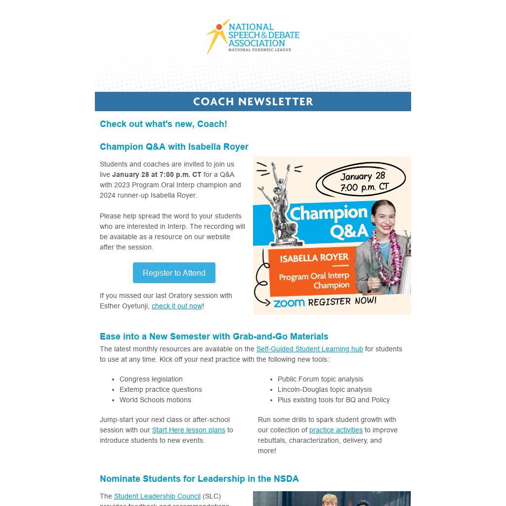 Students and coaches are invited to join us live January 28 at 7:00 p.m. CT for a Q&A with 2023 Program Oral Interp champion and 2024 runner-up Isabella Royer.