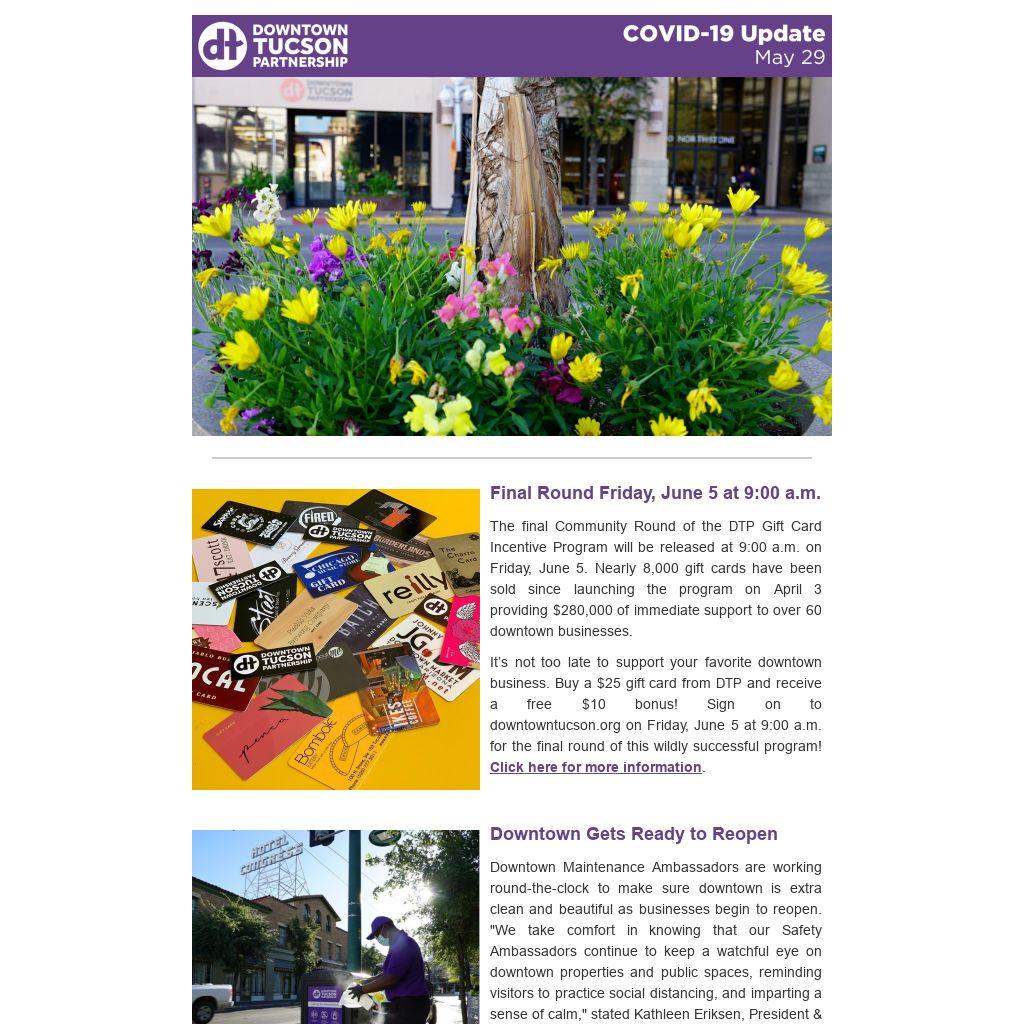 Downtown Maintenance Ambassadors are working round-the-clock to make sure downtown is extra clean and beautiful as businesses begin to reopen. "We take comfort in knowing that our Safety Ambassadors continue to keep a watchful eye on downtown properties and public spaces, reminding visitors to practice social distancing, and imparting a sense of calm," stated Kathleen Eriksen, President & CEO of Downtown Tucson Partnership (DTP). "When the time is right, DTP is here, ready to welcome the community back downtown."