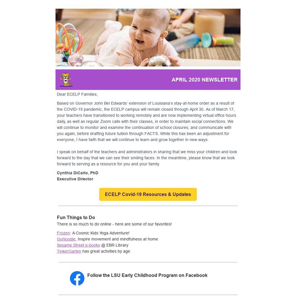 Based on Governor John Bel Edwards’ extension of Louisiana’s stay-at-home order as a result of the COVID-19 pandemic, the ECELP campus will remain closed through April 30. As of March 17, your teachers have transitioned to working remotely and are now implementing virtual office hours daily, as well as regular Zoom calls with their classes, in order to maintain social connections. We will continue to monitor and examine the continuation of school closures, and communicate with you again, before drafting future tuition through FACTS. While this has been an adjustment for everyone, I have faith that we will continue to learn and grow together in new ways.