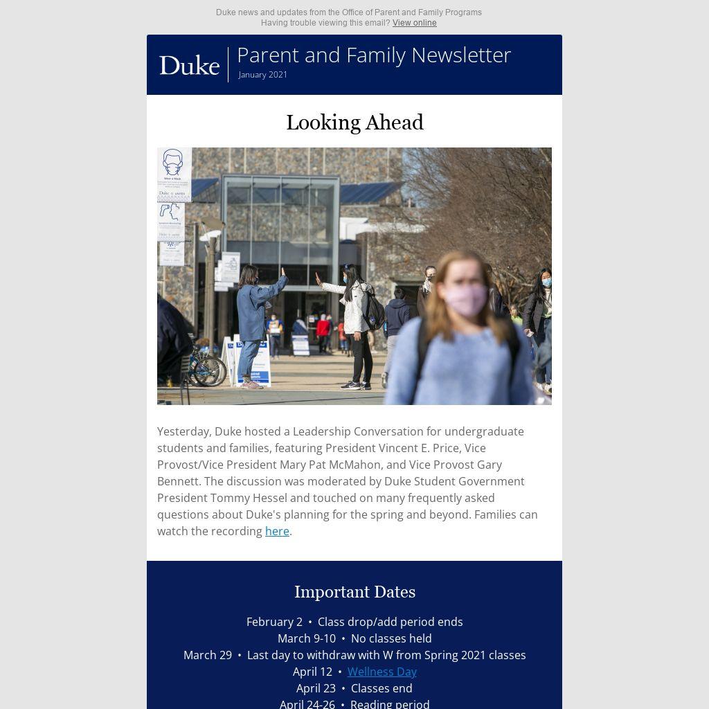 Yesterday, Duke hosted a Leadership Conversation for undergraduate students and families, featuring President Vincent E. Price, Vice Provost/Vice President Mary Pat McMahon, and Vice Provost Gary Bennett. The discussion was moderated by Duke Student Government President Tommy Hessel and touched on many frequently asked questions about Duke's planning for the spring and beyond. Families can watch the recording here.