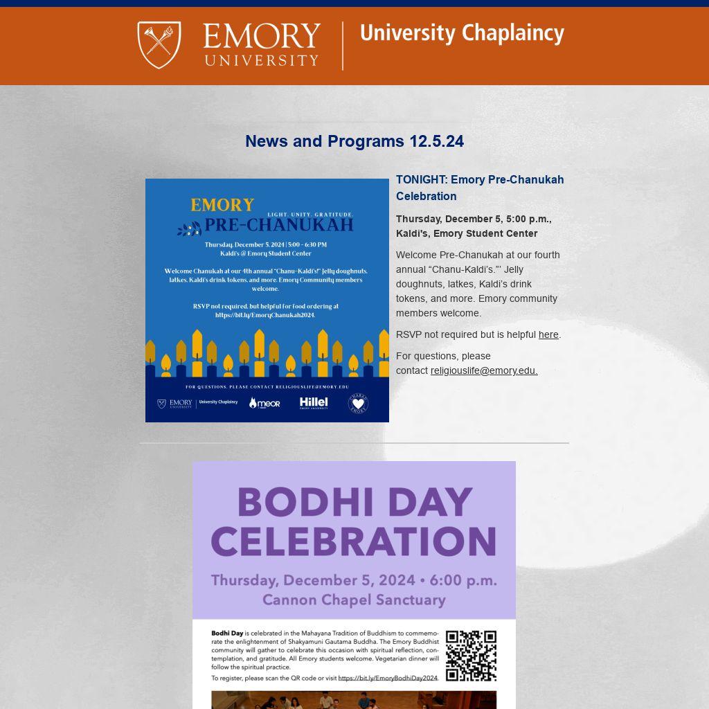 Emory University Chaplaincy ENews is published weekly during term publicizing Atlanta-campus spiritual life programs. It is not a comprehensive listing. For Oxford College spiritual life, please click here. To submit information or to update your preferences, please contact religiouslife@emory.edu.