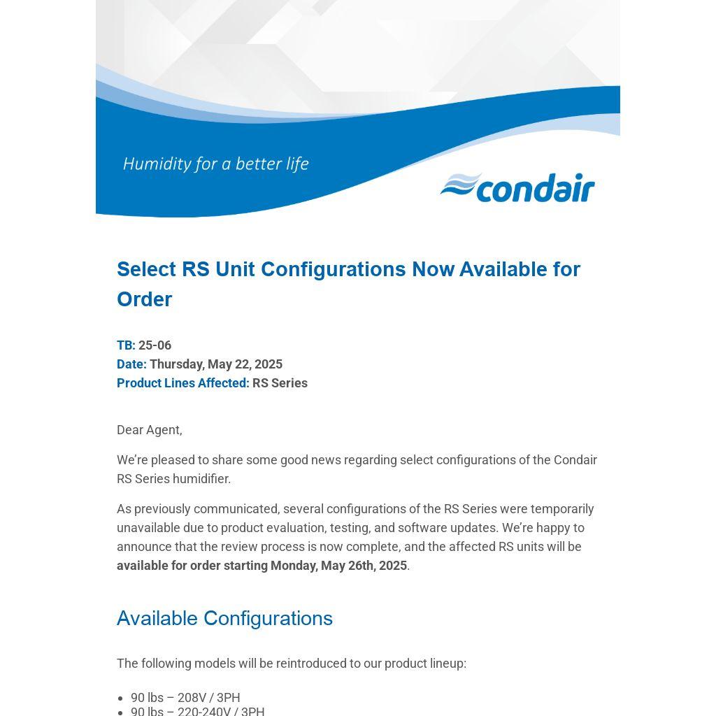 We’re pleased to share some good news regarding select configurations of the Condair RS Series humidifier.