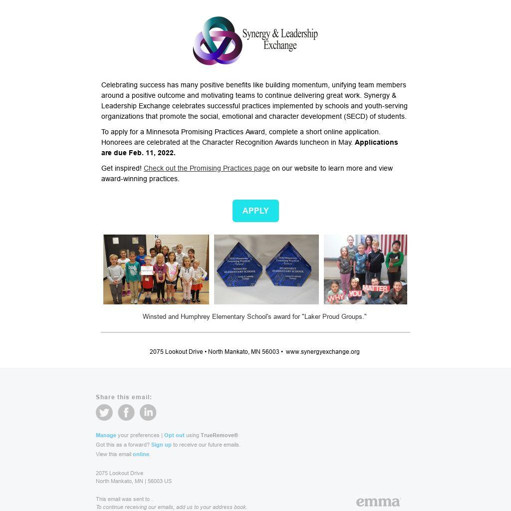 To apply for a Minnesota Promising Practices Award, complete a short online application. Honorees are celebrated at the Character Recognition Awards luncheon in May. Applications are due Feb. 11, 2022.