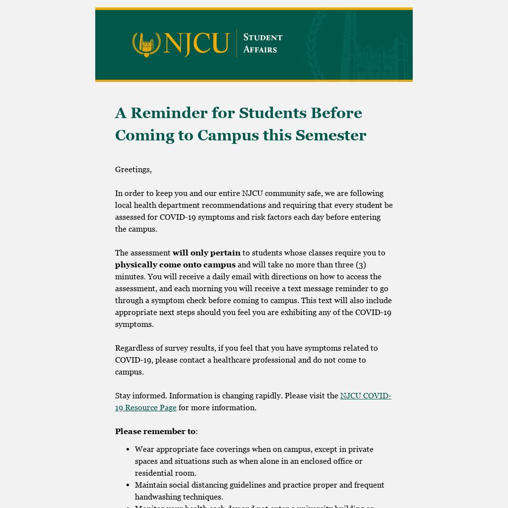 In order to keep you and our entire NJCU community safe, we are following local health department recommendations and requiring that every student be assessed for COVID-19 symptoms and risk factors each day before entering the campus.