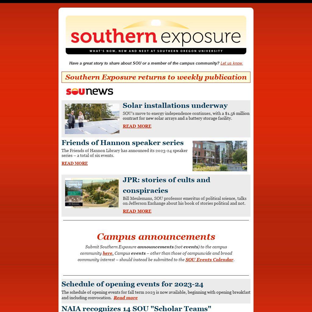 Submit Southern Exposure announcements (not events) to the campus community here. Campus events – other than those of campuswide and broad community interest – should instead be submitted to the SOU Events Calendar.