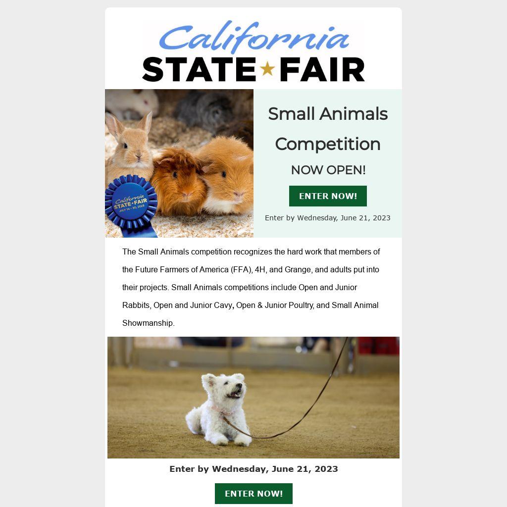 The Small Animals competition recognizes the hard work that members of the Future Farmers of America (FFA), 4H, and Grange, and adults put into their projects. Small Animals competitions include Open and Junior Rabbits, Open and Junior Cavy, Open & Junior Poultry, and Small Animal Showmanship.