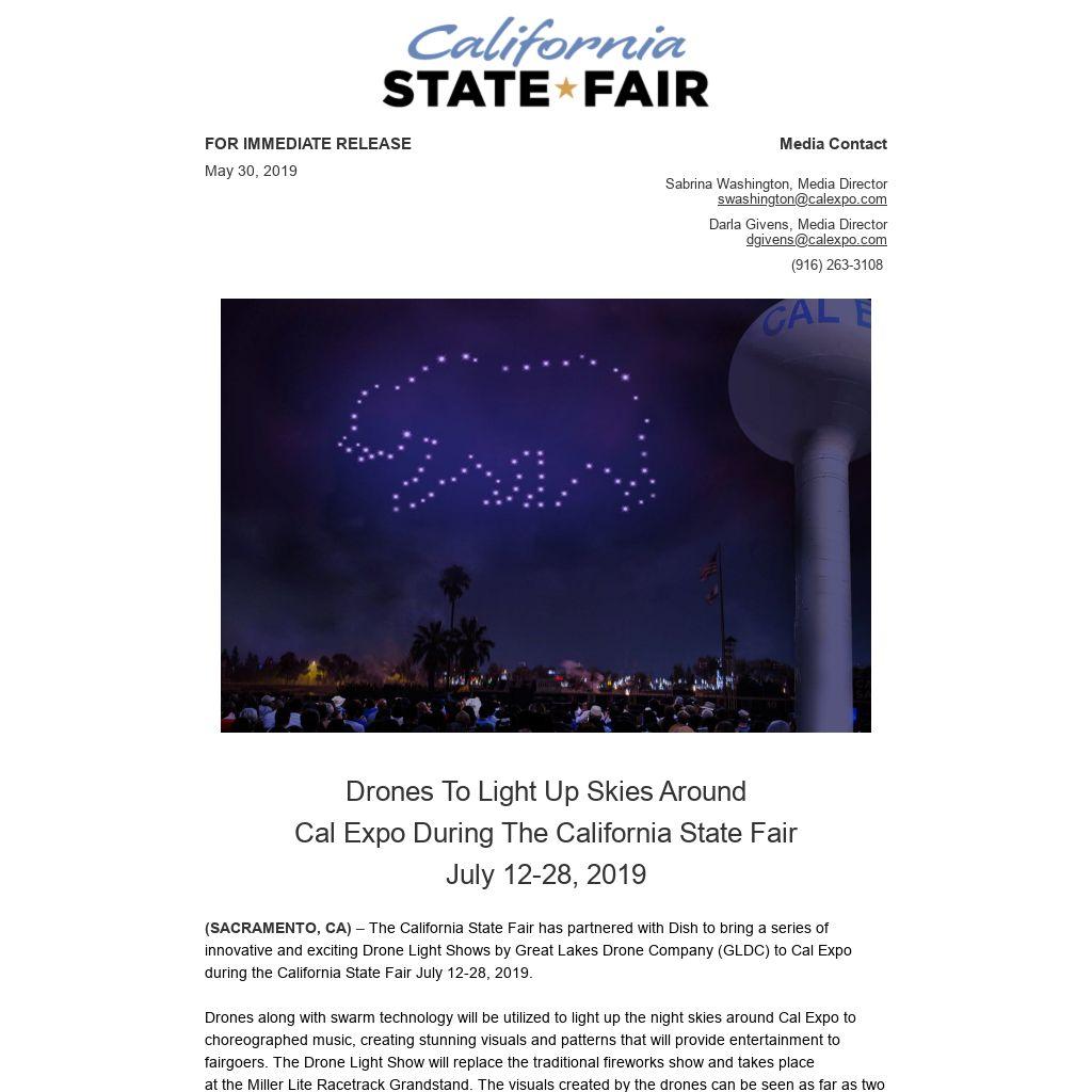 “We are looking forward to being a part of the entertainment line-up for the California State Fair this year, producing a 80 drone custom show with the latest swarm technology utilizing bright color-changing LED lights, creating a variety shapes, and 3-dimensional formations is sure to amaze,” said Matt Quinn, Director of Operations and CEO of GLDC.