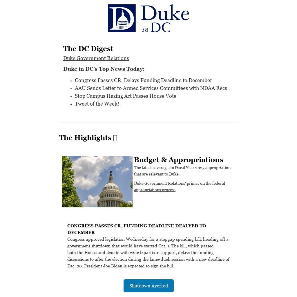 The Association of American Universities (AAU), of which Duke is a member, joined the American Public and Land-grant Universities (APLU) in a letter to the House and Senate Armed Services Committees regarding the FY25 National Defense Authorization Act (NDAA). They supported provisions that align Department of Defense (DOD) funding timelines with academic calendars and a pilot program for shared classified infrastructure access. However, they raised concerns about several sections, including: