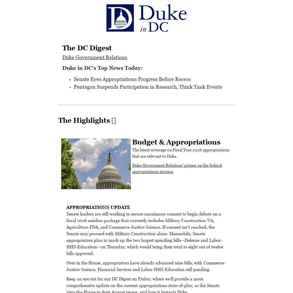 Keep an eye out for our DC Digest on Friday, where we'll provide a more comprehensive update on the current appropriations state-of-play, as the Senate joins the House in their August recess, and how it impacts Duke.