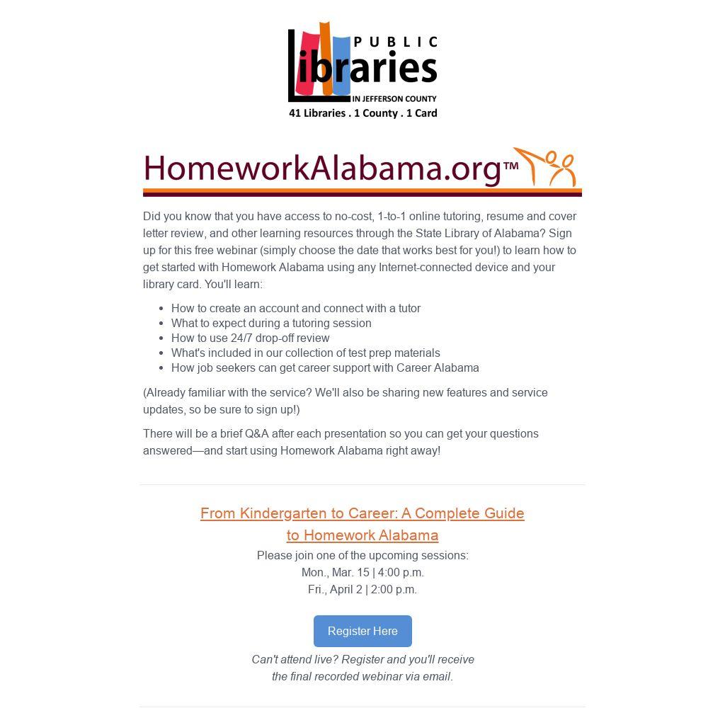 Did you know that you have access to no-cost, 1-to-1 online tutoring, resume and cover letter review, and other learning resources through the State Library of Alabama? Sign up for this free webinar (simply choose the date that works best for you!) to learn how to get started with Homework Alabama using any Internet-connected device and your library card. You'll learn: