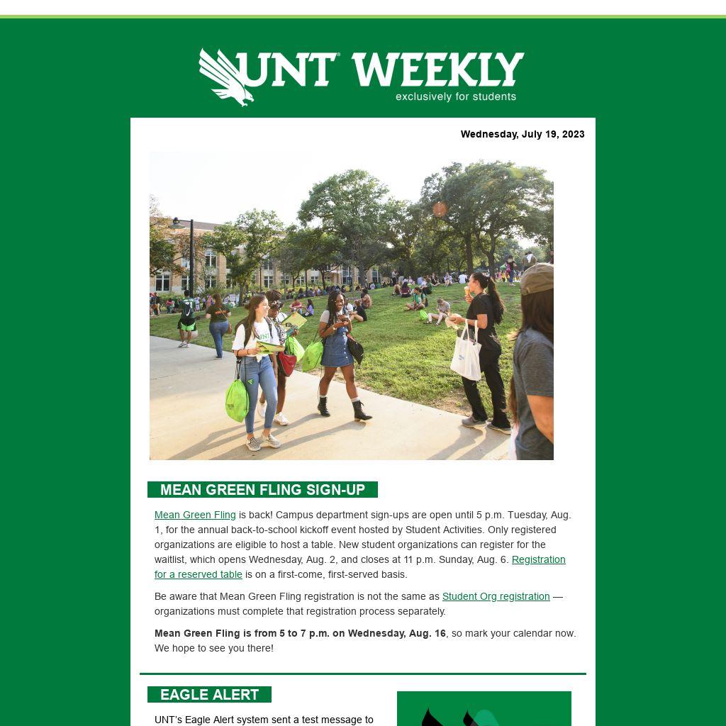 Mean Green Fling is back! Campus department sign-ups are open until 5 p.m. Tuesday, Aug. 1, for the annual back-to-school kickoff event hosted by Student Activities. Only registered organizations are eligible to host a table. New student organizations can register for the waitlist, which opens Wednesday, Aug. 2, and closes at 11 p.m. Sunday, Aug. 6. Registration for a reserved table is on a first-come, first-served basis.