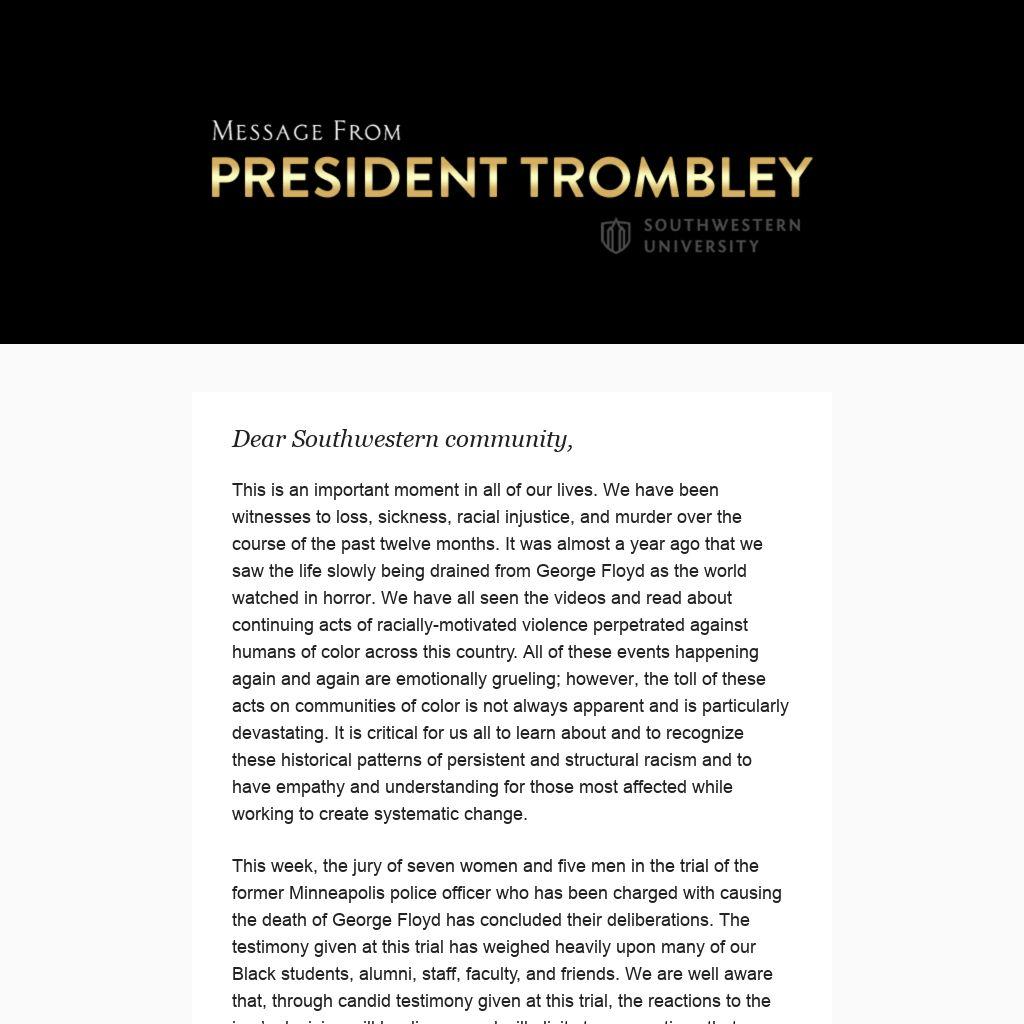 In preparing for this verdict, we must continue to stand in steadfast solidarity with our communities of color. I am calling for us all to support one another in this awful time of challenge through our compassion and respect. We will move bravely and without pause into our shared future where we will all be called upon to create a stronger Southwestern that will embrace the tenets of diversity, inclusion, belonging, and equity. I am always thinking about ways that I can continue to strengthen the fabric of our community through not only my words, but through my actions. On Friday, the Board of Trustees unanimously approved a Tactical Plan that has been in development by a 20-person taskforce throughout the academic year that has DIBE and student financial access at its core. There is much work to be done and we will go there together to forge a more socially just and equitable Southwestern.