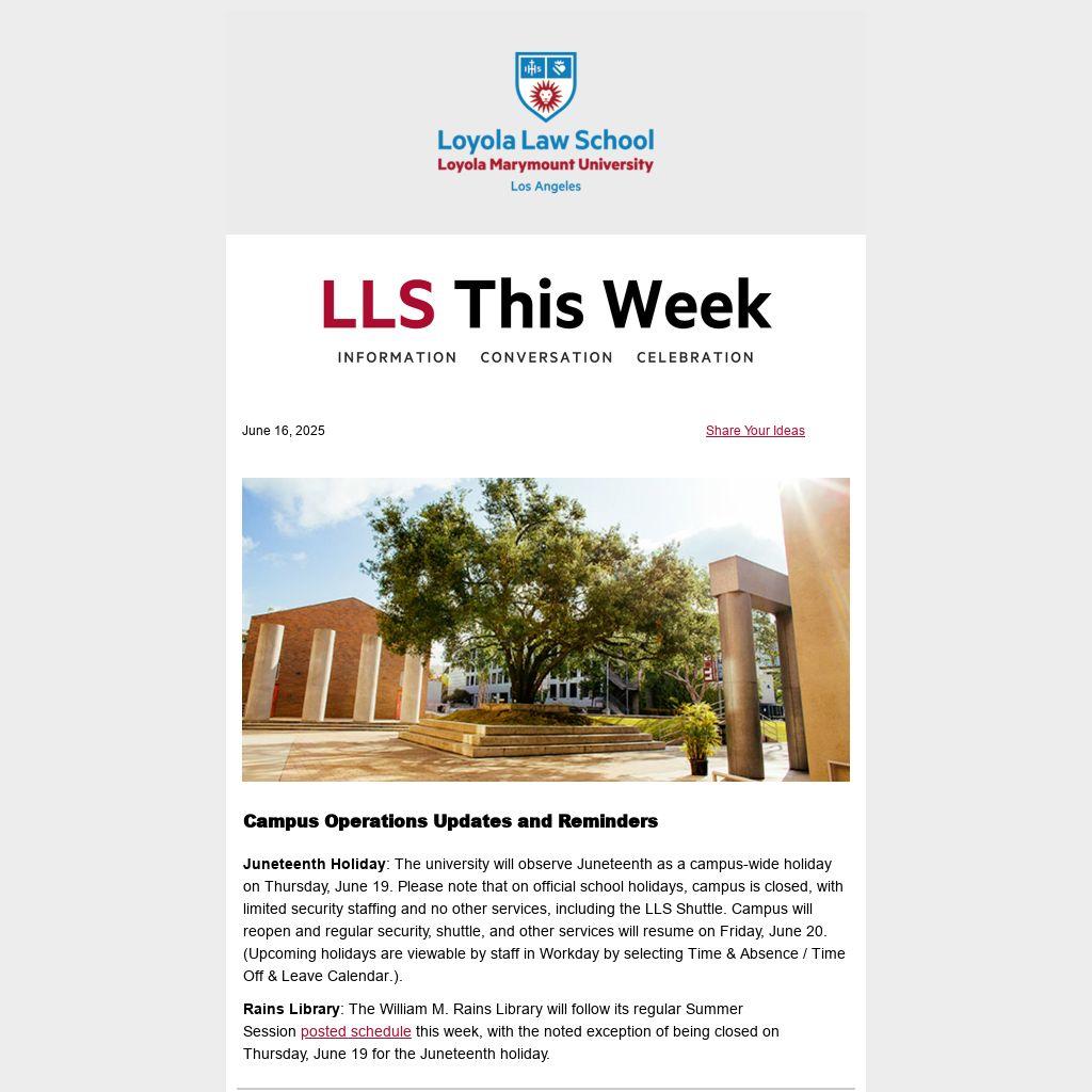 Juneteenth Holiday: The university will observe Juneteenth as a campus-wide holiday on Thursday, June 19. Please note that on official school holidays, campus is closed, with limited security staffing and no other services, including the LLS Shuttle. Campus will reopen and regular security, shuttle, and other services will resume on Friday, June 20. (Upcoming holidays are viewable by staff in Workday by selecting Time & Absence / Time Off & Leave Calendar.).