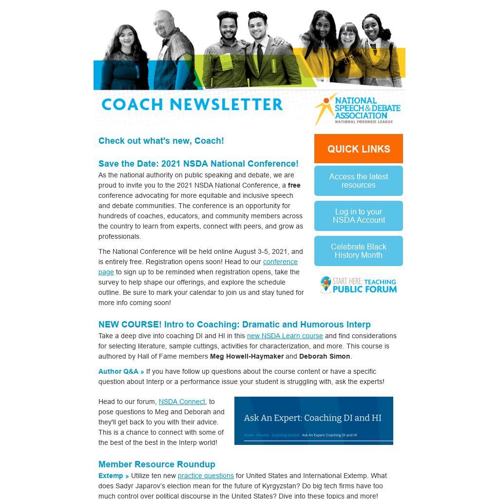 As the national authority on public speaking and debate, we are proud to invite you to the 2021 NSDA National Conference, a free conference advocating for more equitable and inclusive speech and debate communities. The conference is an opportunity for hundreds of coaches, educators, and community members across the country to learn from experts, connect with peers, and grow as professionals.