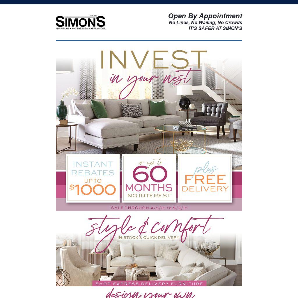 Free delivery with $599 purchase within 15 miles of 02038. Extended financing up to 60 months no interest or instant discounts. Instant discounts of $50 off $799. $100 off $1499, $200 off $2999, $300 off $4499, $400 off $5999, $500 off $7499, $600 off $9999, $800 off $12999, $1000 off $14999. Instant cash discounts exclude appliances, mattresses, Stressless, clearance, floor samples and special purchases. Offer ends 4/26/21.