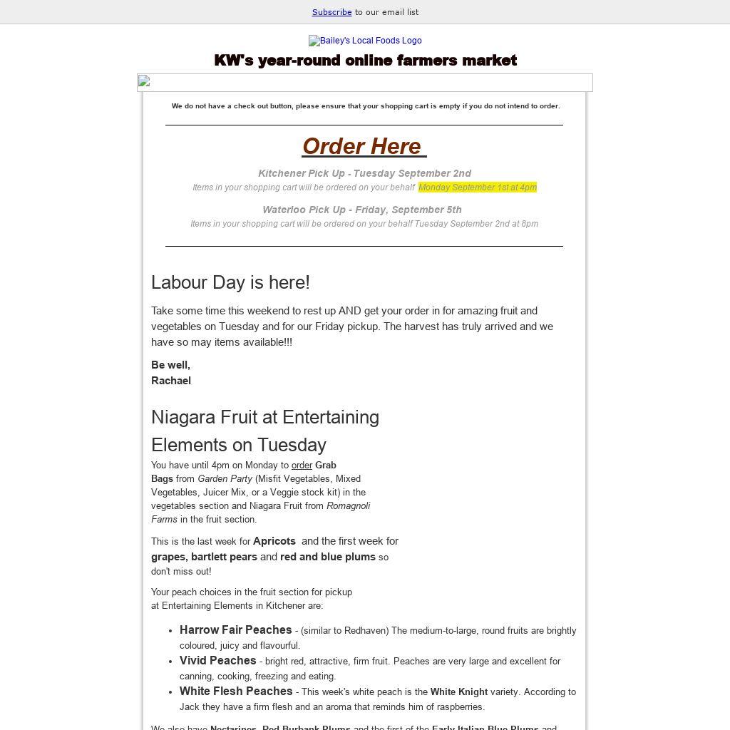Stop in to our Tuesday market in downtown Kitchener!  Ordering is open Friday to Monday so you can pre-order Bulk Fruit at baileyslocafoods.ca/ordering