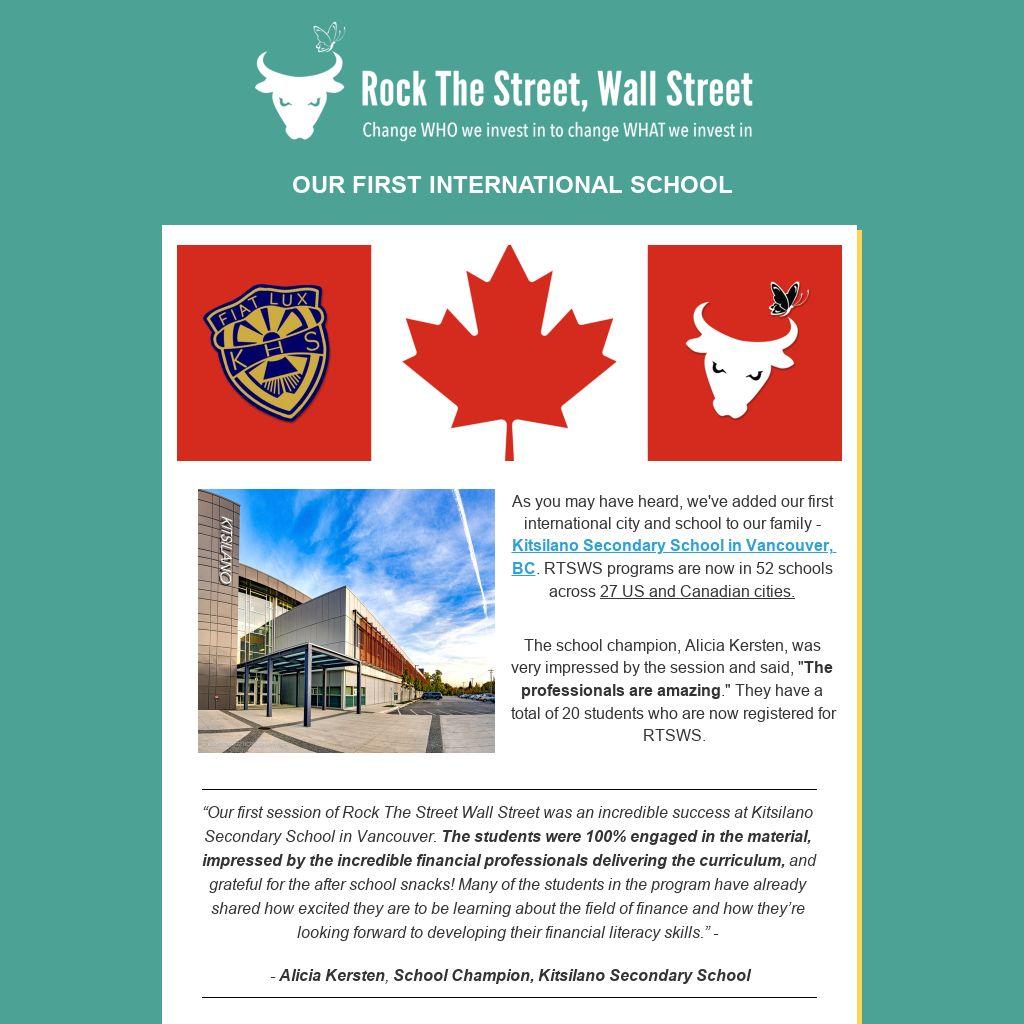 “Our first session of Rock The Street Wall Street was an incredible success at Kitsilano Secondary School in Vancouver. The students were 100% engaged in the material, impressed by the incredible financial professionals delivering the curriculum, and grateful for the after school snacks! Many of the students in the program have already shared how excited they are to be learning about the field of finance and how they’re looking forward to developing their financial literacy skills.” -