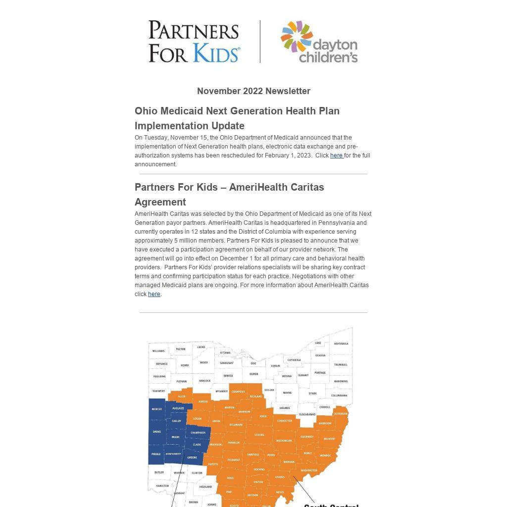 AmeriHealth Caritas was selected by the Ohio Department of Medicaid as one of its Next Generation payor partners. AmeriHealth Caritas is headquartered in Pennsylvania and currently operates in 12 states and the District of Columbia with experience serving approximately 5 million members. Partners For Kids is pleased to announce that we have executed a participation agreement on behalf of our provider network. The agreement will go into effect on December 1 for all primary care and behavioral health providers. Partners For Kids’ provider relations specialists will be sharing key contract terms and confirming participation status for each practice. Negotiations with other managed Medicaid plans are ongoing. For more information about AmeriHealth Caritas click here.