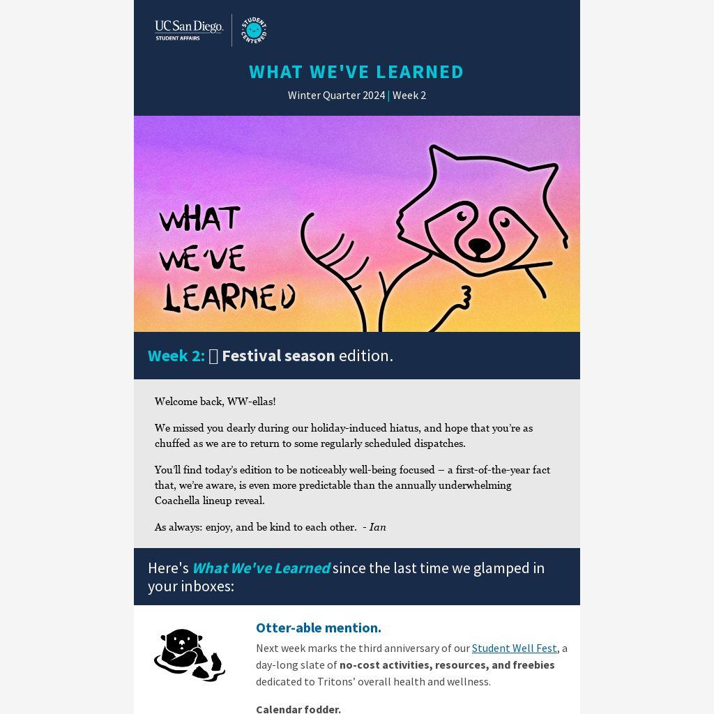 Whether you go for the interactive sessions dedicated to our eight dimensions of well-being or for the plushie and water bottle giveaways adorned with cute little ocean-raccoons – we hope to see you in Price Center on January 24.