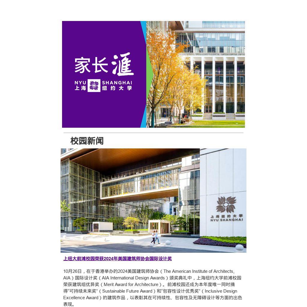 10月26日,在于香港举办的2024美国建筑师协会(The American Institute of Architects, AIA)国际设计奖(AIA International Design Awards)颁奖典礼中,上海纽约大学前滩校园荣获建筑组优异奖(Merit Award for Architecture)。前滩校园还成为本年度唯一同时摘得“可持续未来奖”(Sustainable Future Award)和“包容性设计优秀奖”(Inclusive Design Excellence Award)的建筑作品,以表彰其在可持续性、包容性及无障碍设计等方面的出色表现。