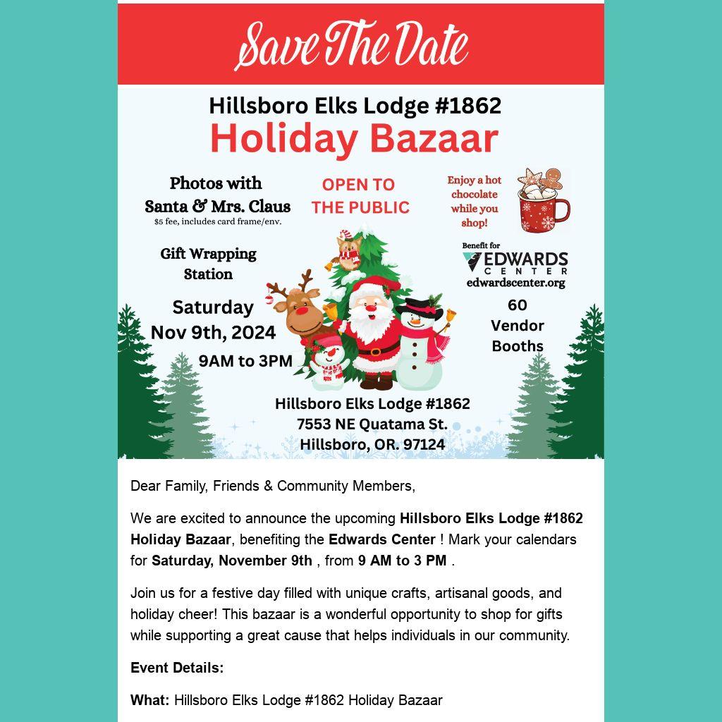 We are excited to announce the upcoming Hillsboro Elks Lodge #1862 Holiday Bazaar, benefiting the Edwards Center ! Mark your calendars for Saturday, November 9th , from 9 AM to 3 PM .