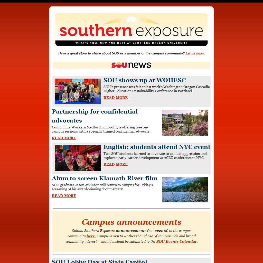Submit Southern Exposure announcements (not events) to the campus community here. Campus events – other than those of campuswide and broad community interest – should instead be submitted to the SOU Events Calendar.