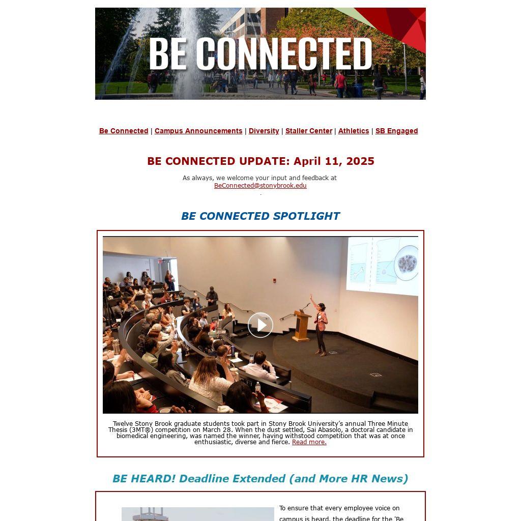 To ensure that every employee voice on campus is heard, the deadline for the 'Be Heard' HR survey has been extended to TOMORROW, Friday, April 11. The survey is completely confidential, and your responses will be instrumental in helping us make our organization an even better place to work. We look forward to hearing from even more of you! Questions or need the survey invite resent? Email be heard@stonybrook.edu. Otherwise, visit stonybrook.edu/hrnow/beheard for instructions on how to locate the survey in your email and complete it.