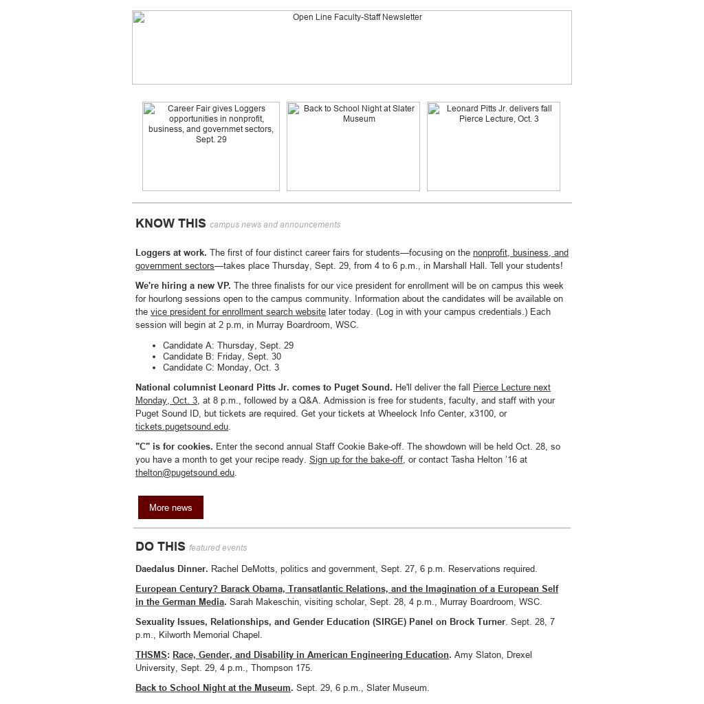 | DO THIS featured events Daedalus Dinner. Rachel DeMotts, politics and government, Sept. 27, 6 p.m. Reservations required.